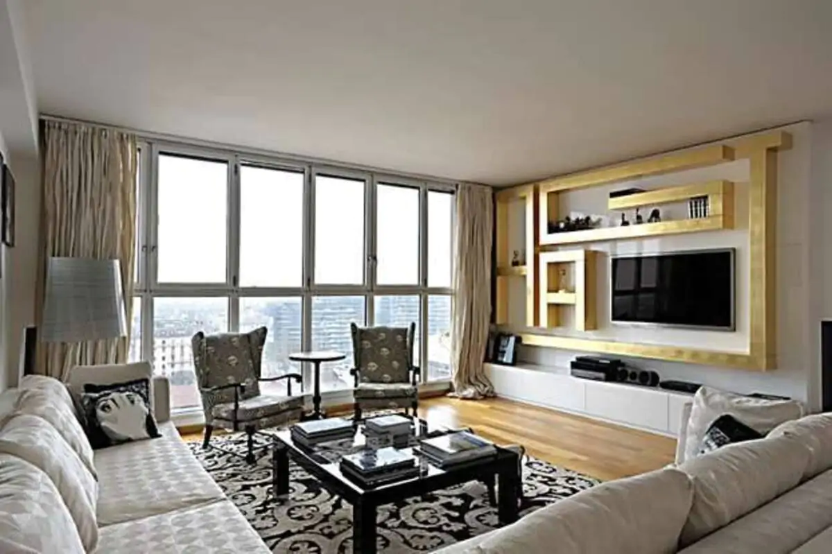 Il soggiorno della casa di Amadeus è uno spazio molto ampio e luminoso. Dominato da grandi finestre che offrono una visuale sulla città di Milano. L’arredamento è nei toni dell’oro, del nero e del bianco, composto da un mobile a parete, con mensole dorate che sembrano formare una tipica decorazione greca. Il divano è un modello angolare, completato da due poltrone con motivi floreali. La zona conversazione è ben costruita e pratica grazie anche al coffee table abbinato al tappeto e alle due poltrone.