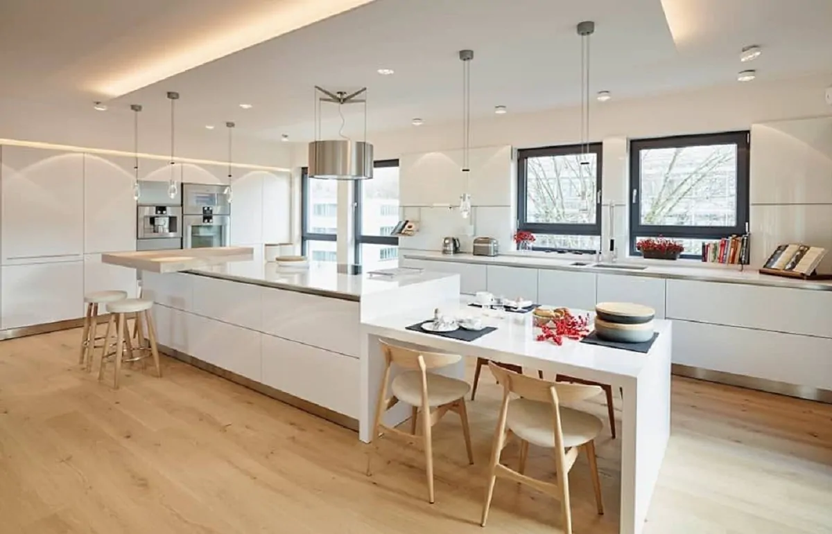 La cucina deve avere soprattutto un ruolo pratico e funzionale, è necessario avere gli spazi giusti per contenere tutto il necessario. I mobili della cucina devono essere di un colore unico, per rendere lo spazio ancora più aperto e ampio, e lucido, che richiami la componente elegante dello stile. Per chi ne ha la possibilità, l’isola in cucina è la soluzione perfetta per la praticità e per donare alla stanza un’immagine imponente e raffinata.