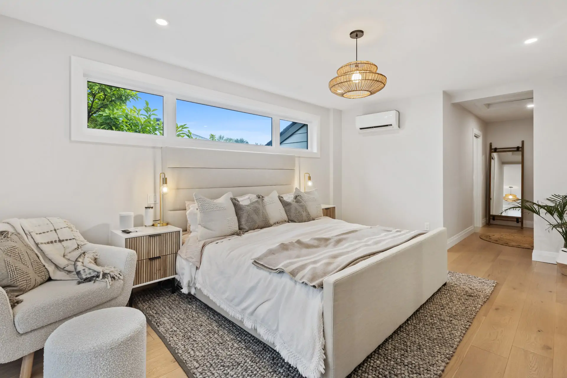 Una scelta sempre sicura per una camera da letto riposante. I grigi tenui sono spesso abbinati a metalli neri o argentati, ma questo schema neutro utilizza invece legni chiari più morbidi. Ci piacciono molto anche i dettagli in seagrass intrecciato del tappeto e del comodino.