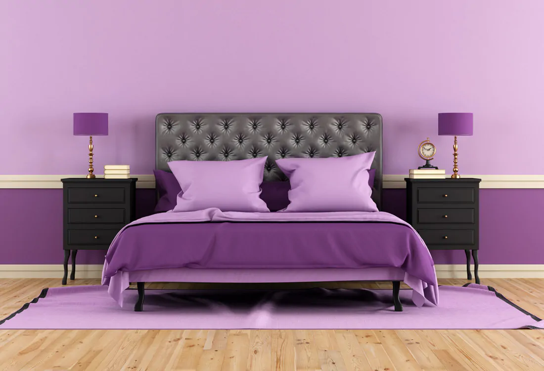 Il colore viola è molto forte, specialmente nelle sue tonalità più scure. Per tal motivo, è sovente sufficiente utilizzarlo su una sola parete e sposarlo con toni neutri, richiamando magari il viola con qualche elemento d’arredo o nella biancheria del letto. Si possono trovare in commercio anche testiere letto imbottite in questa colorazione.