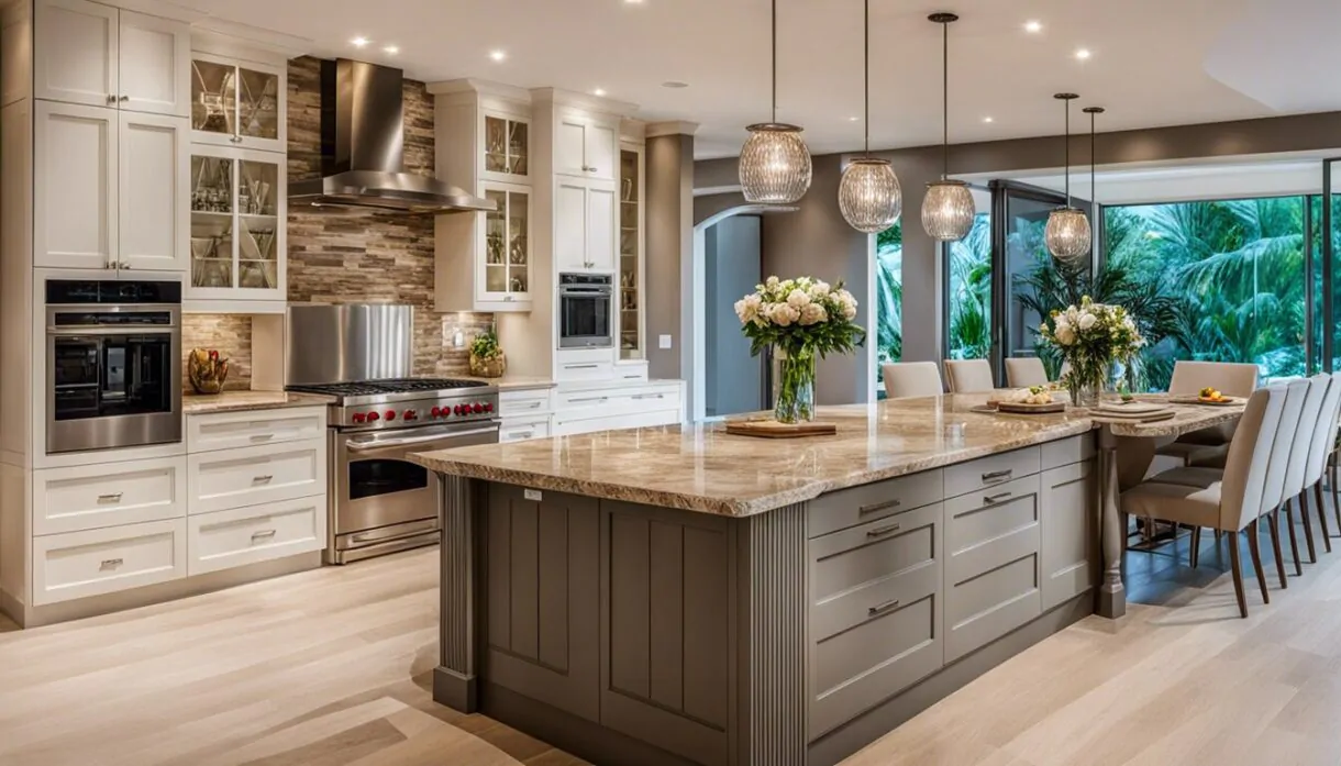 La cucina della casa appare molto spesso, perchè luogo di condivisione per una famiglia: il modello è quello ad isola, che vede al centro il lavabo fatto di marmo bianco, molto elegante, e tutto intorno mobili dove riporre il cibo, sempre su tonalità chiare, come quella del grigio ghiaccio che si sposa perfettamente con il materiale marmoreo.