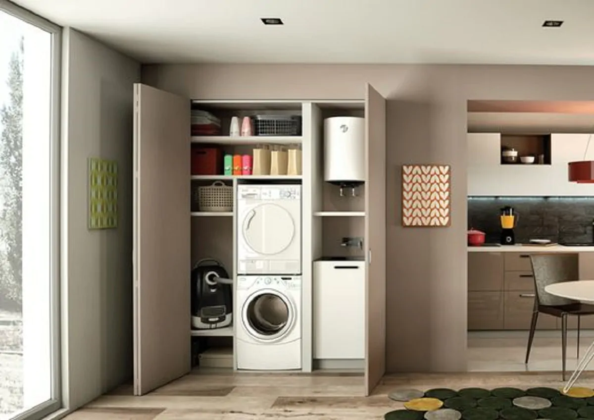 Anche la cucina può essere adibita a lavanderia, nonostante sembri il posto meno adatto. Nascondete lavatrice e asciugatrice con una tenda o con una porta a scomparsa o a soffietto.