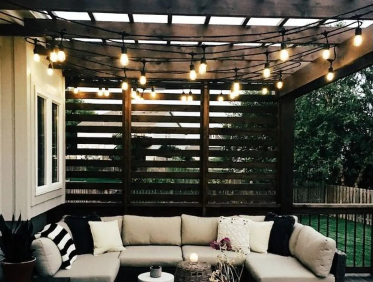 Aggiungere uno o più separè in legno aiuterà a creare una veranda sempre aperta, ma con più privacy. Esistono separè di design di diversi tipi tra cui scegliere. Quello in questo esempio crea un contrasto molto carino con il pavimento dipinto di bianco.