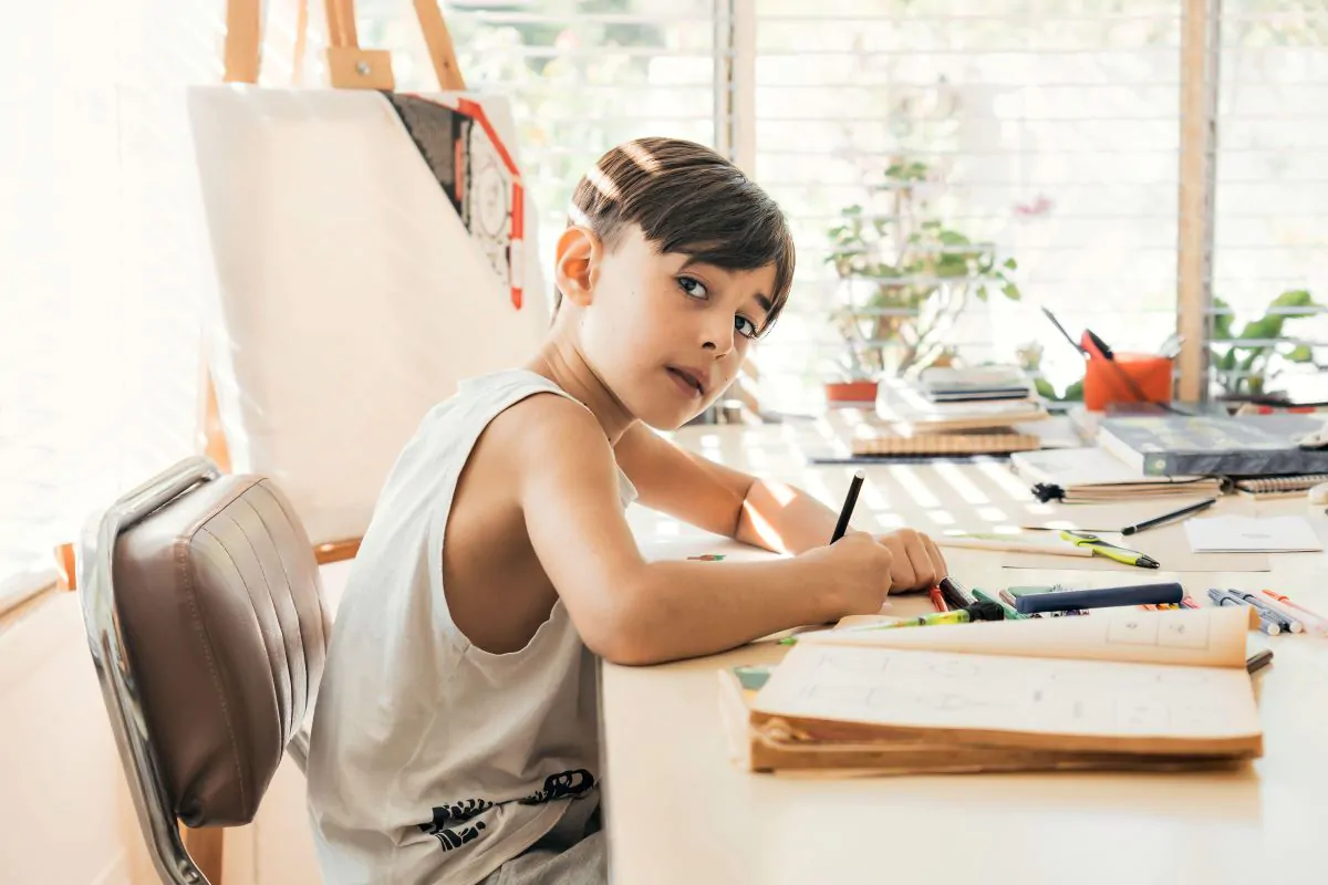 La cosa più importante è creare uno spazio di lavoro che abbia una “casa” per i diversi oggetti, in modo che il bambino non debba lasciare il tavolo per completare un compito. Un esempio potrebbe essere quello di doversi alzare ogni volta che deve temperare una matita.