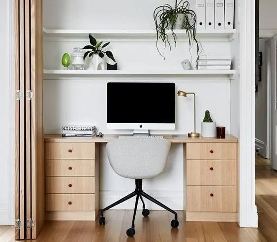 Installa le porte degli armadi e aggiungi l’hardware desiderato. Ritaglia la carta da parati per adattarla all’interno degli inserti delle porte e falla aderire con la colla artigianale. Personalizza gli interni con organizzatori per aumentare le capacità di stoccaggio. Questa postazione di lavoro è anche comunemente chiamata Cloffice, e ultimamente è davvero gettonata.