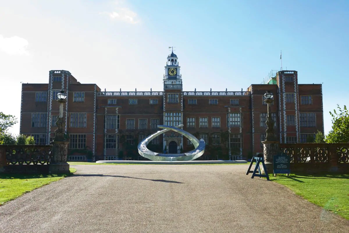 Una gigantesca scultura d’acqua rinascimentale di Angela Conner si erge sulla facciata di questa raffinata casa di campagna giacobiana, che è ufficialmente una delle 10 case del tesoro d’Inghilterra.