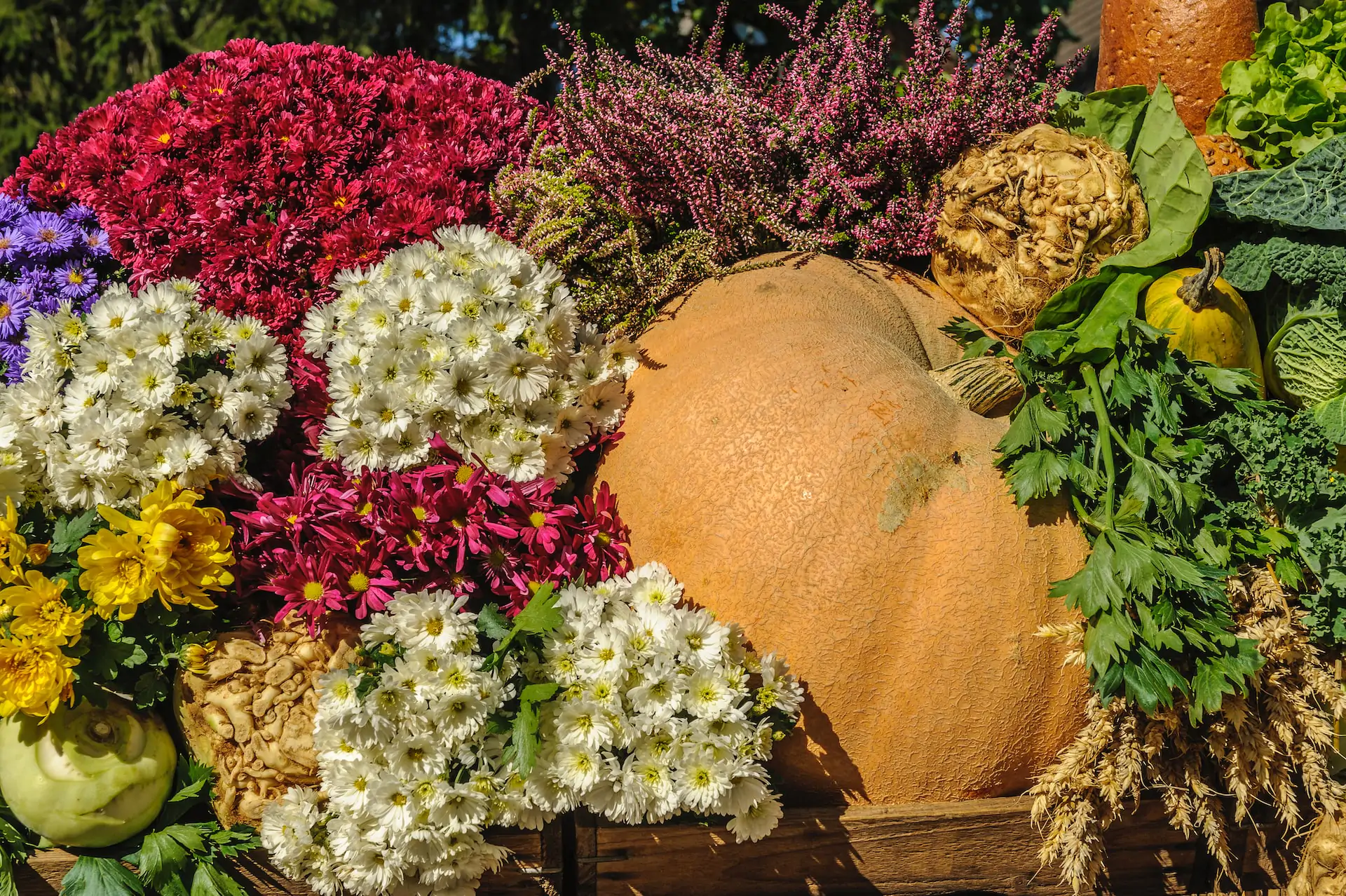 Questo contenitore autunnale è fantasioso e bellissimo. L’uso dell’agrodolce, dei rami, del muschio e dell’edera danno consistenza alla fioriera. E la zucca gigante e il cavolo a fiore rendono l’atmosfera autunnale.