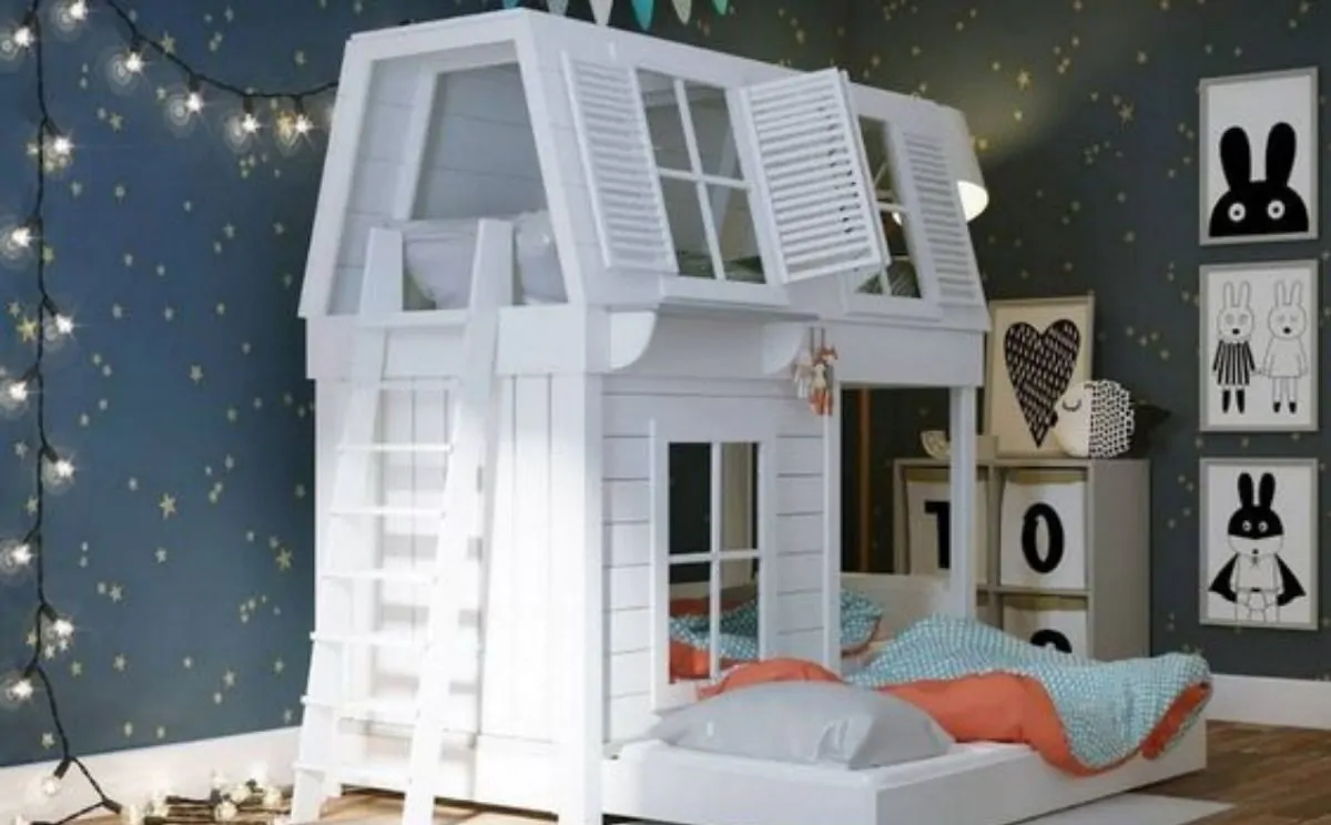 In questa originale struttura, i letti assumono la forma di una casetta bianca. Di certo un modo molto carino di permettere alle bimbe che dormiranno in questi letti di giocare con la fantasia. Bella la cura per i dettagli, con le finestre all’inglese e i vasi per i fiori.
