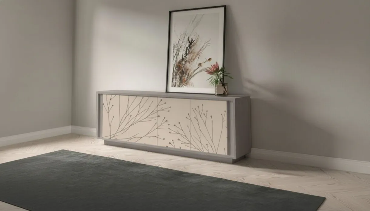 Un’altra idea creativa è quella dell’armonia con le decorazioni delle pareti. Se per queste ultime è stata scelta una boiserie con decorazioni verticali, il senso della verticalità si può riprendere senza problemi tramite il frontale delle ante della madia.