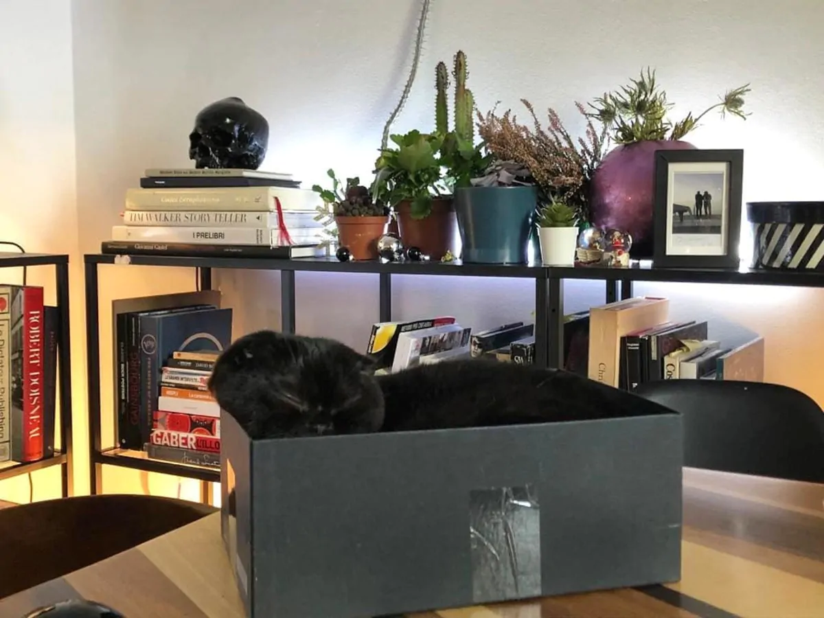 La parete dove si trova la televisione è caratterizzata da una serie di scaffali contenenti dei cd, mentre il mobile portatelevisore è di fattura bassa, tipico degli anni Cinquanta, anche qui sono presenti dei ripiani che la cantante ha utilizzato per riporre alcuni libri. Possiamo notare inoltre un tavolino con una grande lampada dal design vintage.