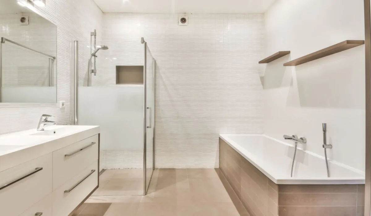 Per ottenere un effetto migliore, si può usare una parete cappuccino tendente al rosa e una parete completamente bianca o in piastrelle scure, magari sul lato della doccia e della vasca. Nel caso della doccia, sarebbe necessaria una cabina in vetro, per rendere la stanza più grande grazie all’effetto ottico.