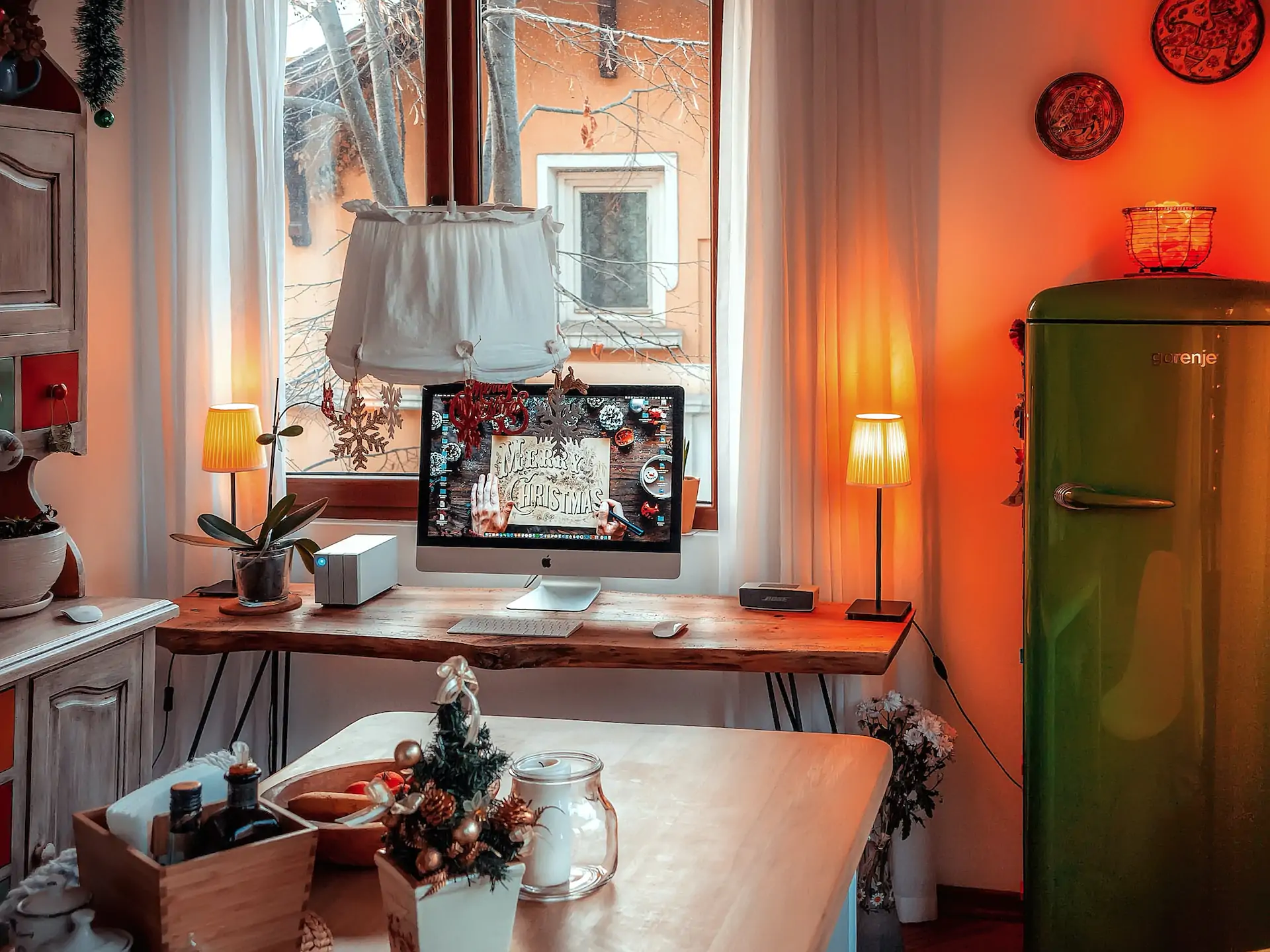 Appendere del verde (finto o vero) intorno alle cornici delle finestre è un ottimo modo per portare l’aria aperta all’interno e dare un’atmosfera accogliente e familiare alla cucina. Potete mantenere le cose semplici con una semplice ghirlanda verde, oppure provare ad aggiungere luci scintillanti, pigne o bacche.